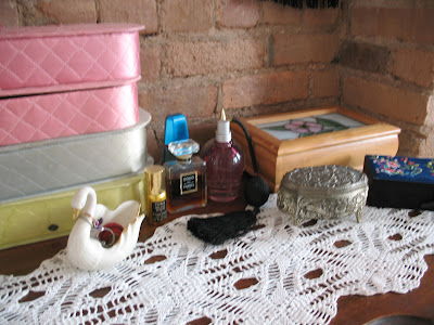 Here are my perfumes and jewelry boxes. The doily runner my Grandmother made, I have a bunch of them!